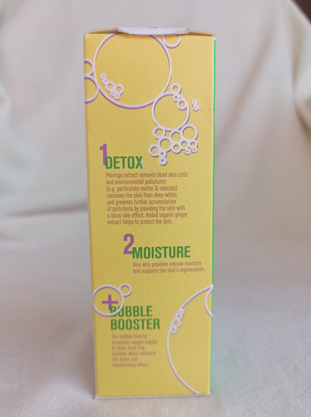 Le Magic Bubble Mask à l'Aloe Vera offre un nettoyage en profondeur, une détoxication et une hydratation en un seul produit. Immédiatement après l'application, le gel se transforme en une mousse de minuscules bulles qui pétillent en quelques secondes. L'extrait de gingembre et l'extrait de Moringa débarrassent votre peau des peaux mortes et des polluants environnementaux. Grâce à son effet lotus, le masque empêche le dépôt d'autres polluants, tandis que l'aloe vera procure une hydratation intense et favorise la régénération de la peau. Le Bubble Booster augmente l'apport en oxygène et crée de petites bulles qui augmentent l'effet purifiant et hydratant du masque.